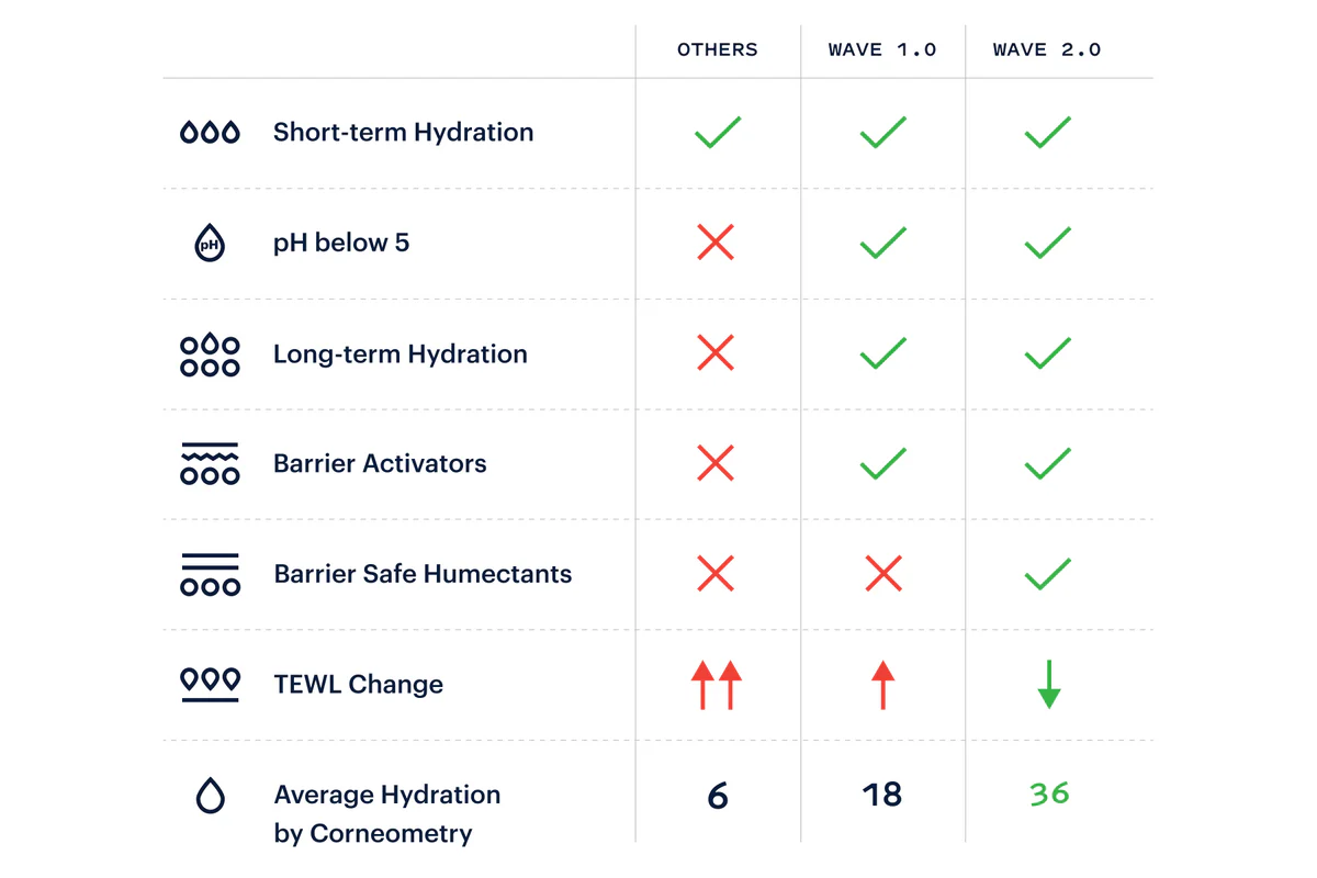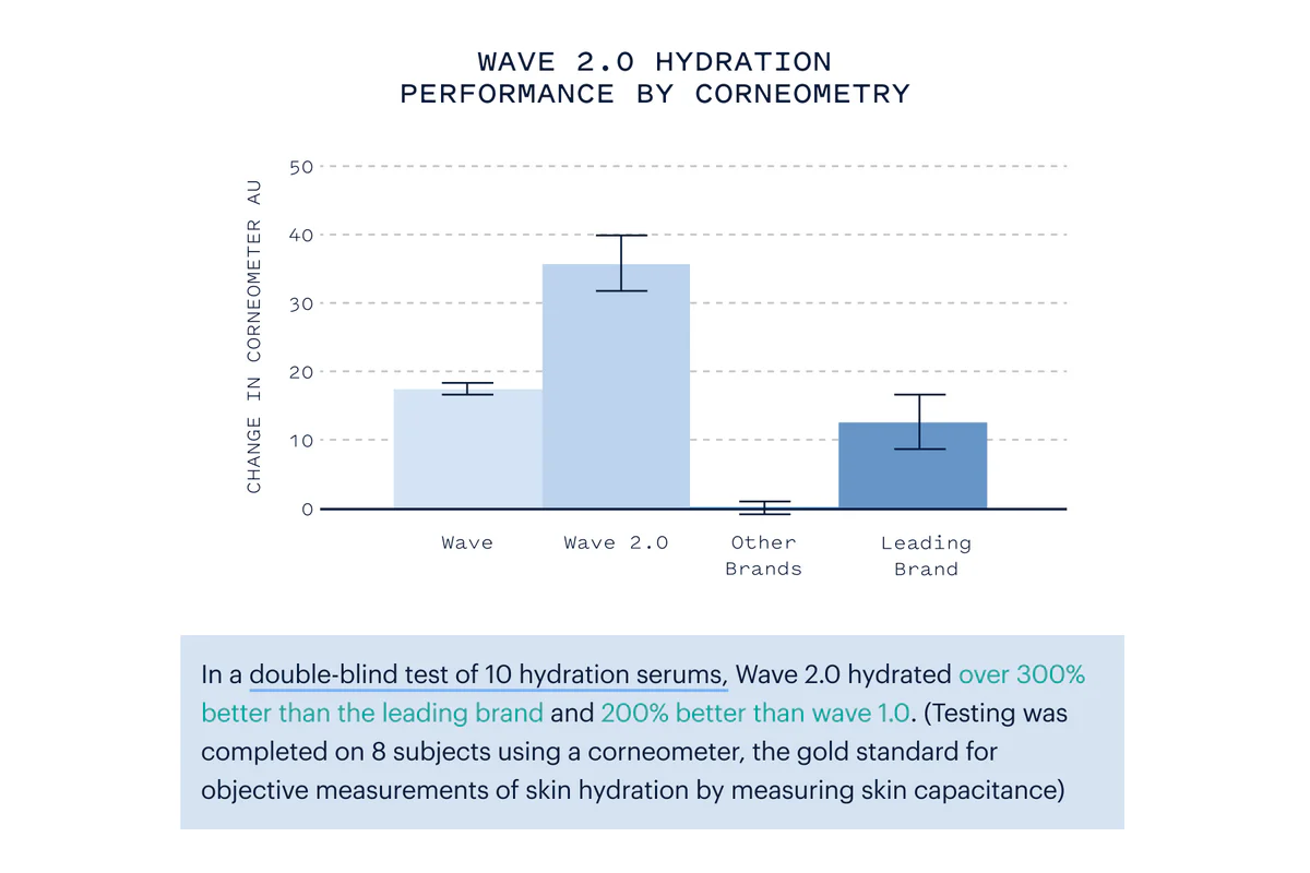 You’ve seen the marketing: some humectants can hold “1000x their weight in water”. But here’s the thing: this doesn’t necessarily translate to more hydrated skin. With Wave 2.0, we spent over a year testing dozens of the best humectants, raising the bar on what made the cut, ruthlessly cutting out the hype. The result: skincare’s best tool for skin hydration.